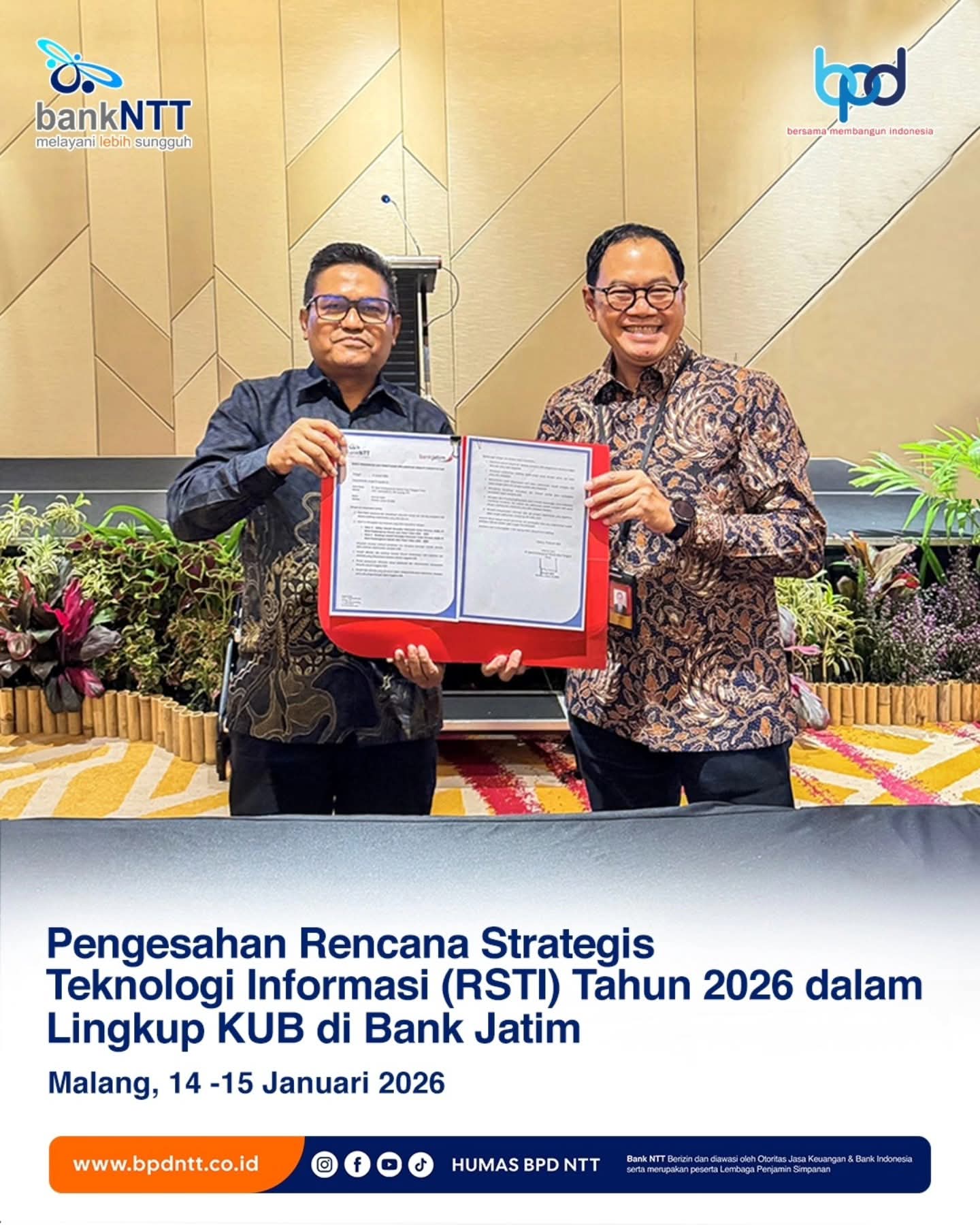 NTT-News.com, Malang – Bank NTT menegaskan komitmennya dalam memperkuat transformasi digital dan tata kelola teknologi informasi melalui keikutsertaan aktif pada Pengesahan Rencana Strategis Teknologi Informasi (RSTI) Tahun 2026 dalam lingkup Kelompok Usaha Bank (KUB) yang diselenggarakan oleh Bank Jatim di Malang, pada 14–15 Januari 2026.