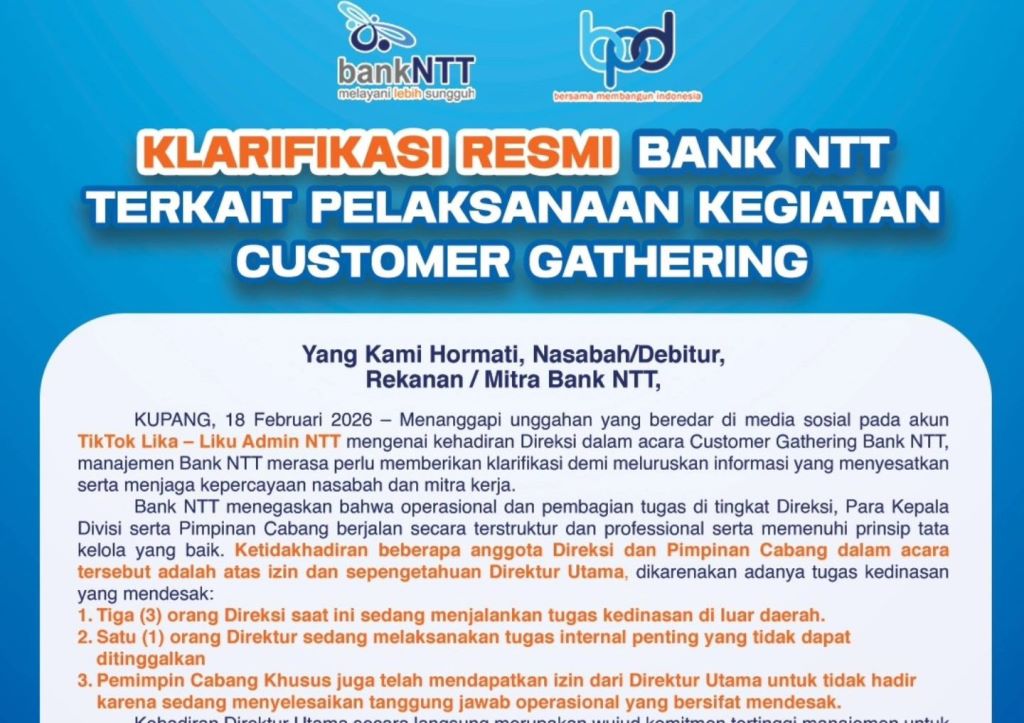 Klarifikasi ini disampaikan menyusul unggahan akun TikTok Lika–Liku Admin NTT yang mempersoalkan kehadiran Direksi Bank NTT tanpa menyajikan konteks dan fakta yang utuh.