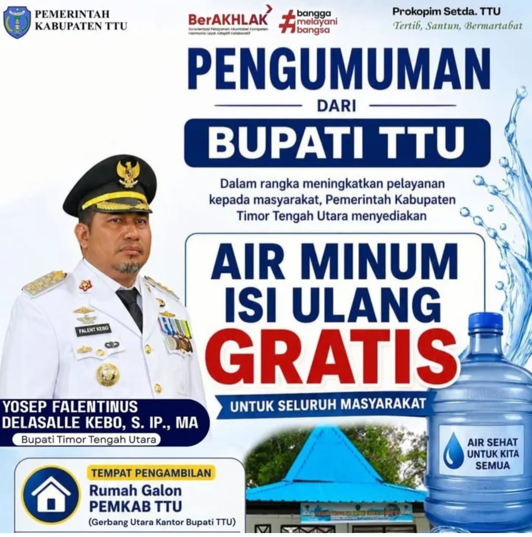 Bupati TTU menambahkan, depot air minum gratis tersebut beroperasi sesuai waktu operasional kantor sehingga masyarakat dapat melakukan pengisian ulang galon sesuai kebutuhan.